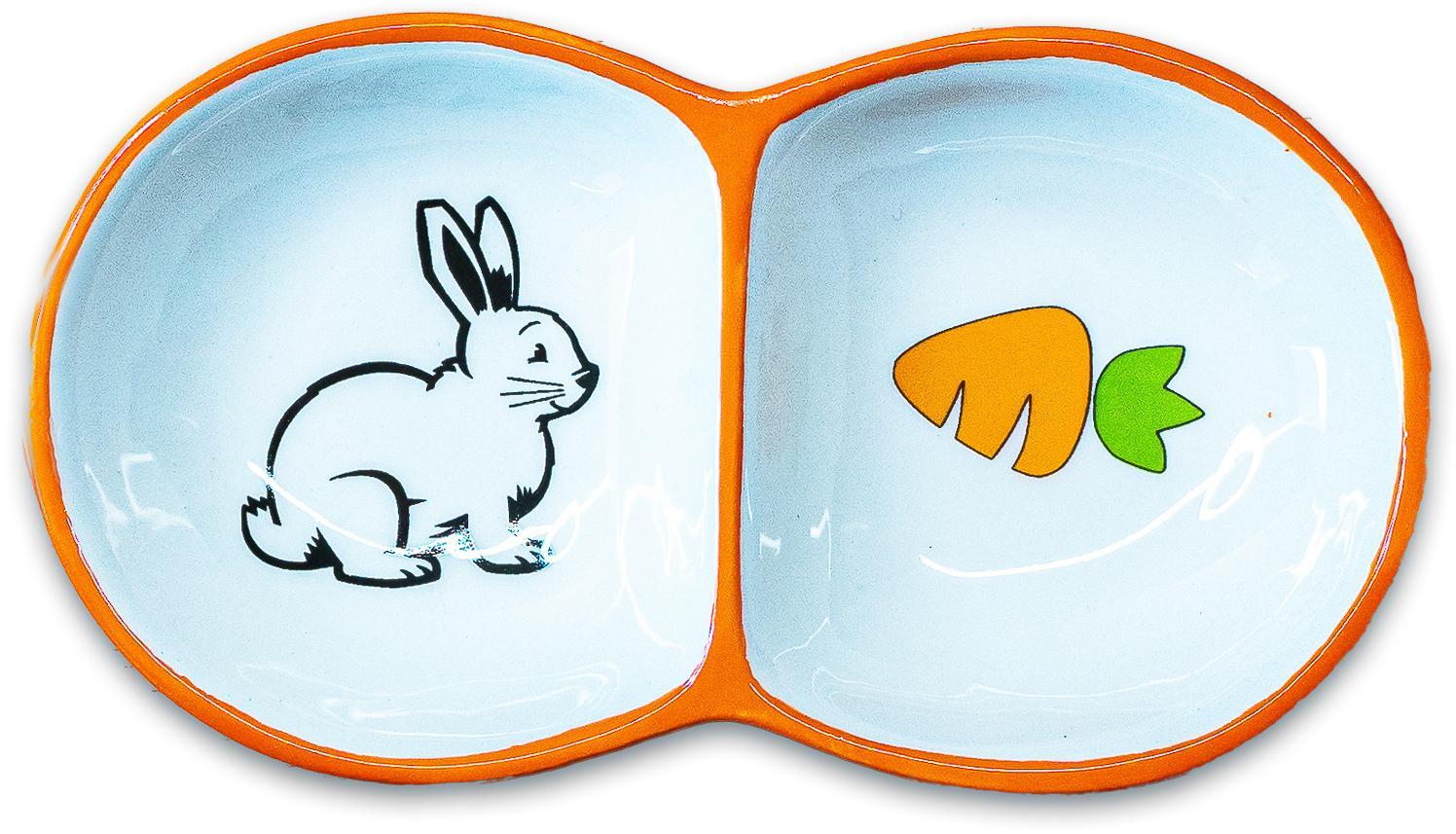 Двойная керамическая миска для грызунов, кролик и морковка. Яркий дизайн подчеркивает индивидуальность владельца.Выполнена из качественных материалов. Удобно использовать и легко мыть.