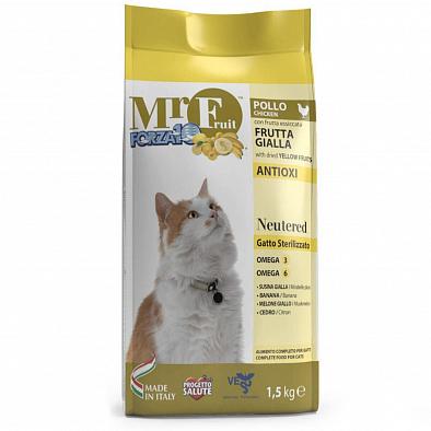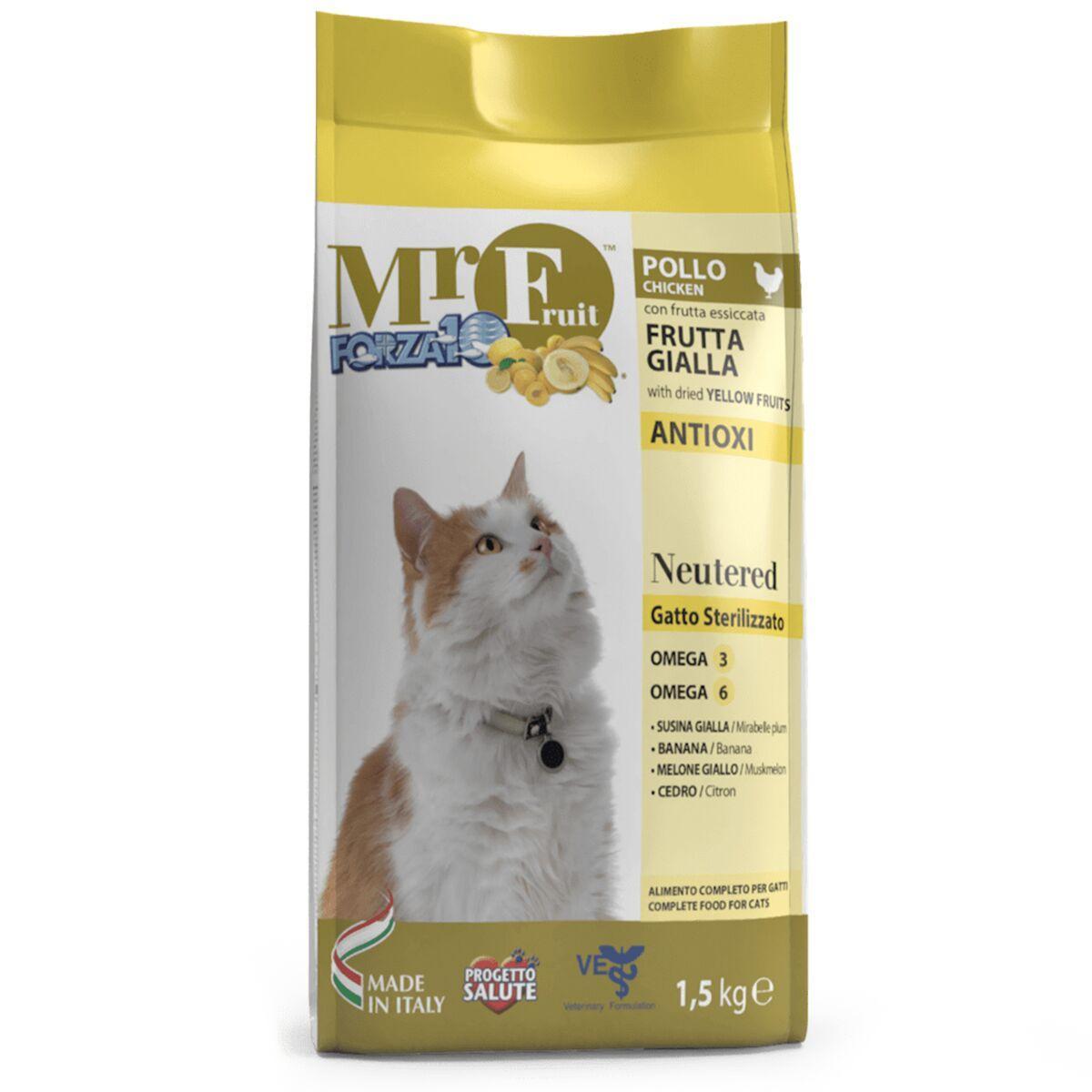 FORZA10 Mr. Fruit Neutered -cпециально разработанный корм для стерилизованных кошек с экстрактами жёлтых фруктов и низкой концентрацией жиров, а также пониженным содержанием минералов, способных стать причиной возникновения мочекаменной болезни. Специфические свойства жёлтых фруктов усиливают действие ингредиентов. Корм не содержит красителей. Кошки, также, как и мы, отличаются различными потребностями в разных возрастных стадиях и у каждого свой образ жизни. Корм Mr. Fruit Neutered разработан для удовлетворения всех потребностей стерилизованных кошек. Основные свойства желтых фруктов: Жёлтая слива: содержит минеральные соли, витамины А,В1, В2 и С. Она обладает мочегонным и детоксикационным свойствами. Слива способствует регулированию веса тела. Банан: обладает питательными, реминерализационными и стимулирующими свойствами, которые полезны для стерилизованных, а также малоподвижных кошек. Он богат калием, который необходим для правильного функционирования сердечно-сосудистой системы. Жёлтая дыня: богата витаминами А и С, а также каротиноидами, антиоксидантными веществами, защищающими клетки организма от старения. Лимон: характеризуется высоким содержанием флавоноидов, обладающих антиоксидантными, тонизирующими и бодрящими свойствами. Помогает контролировать уровень сахара в крови.