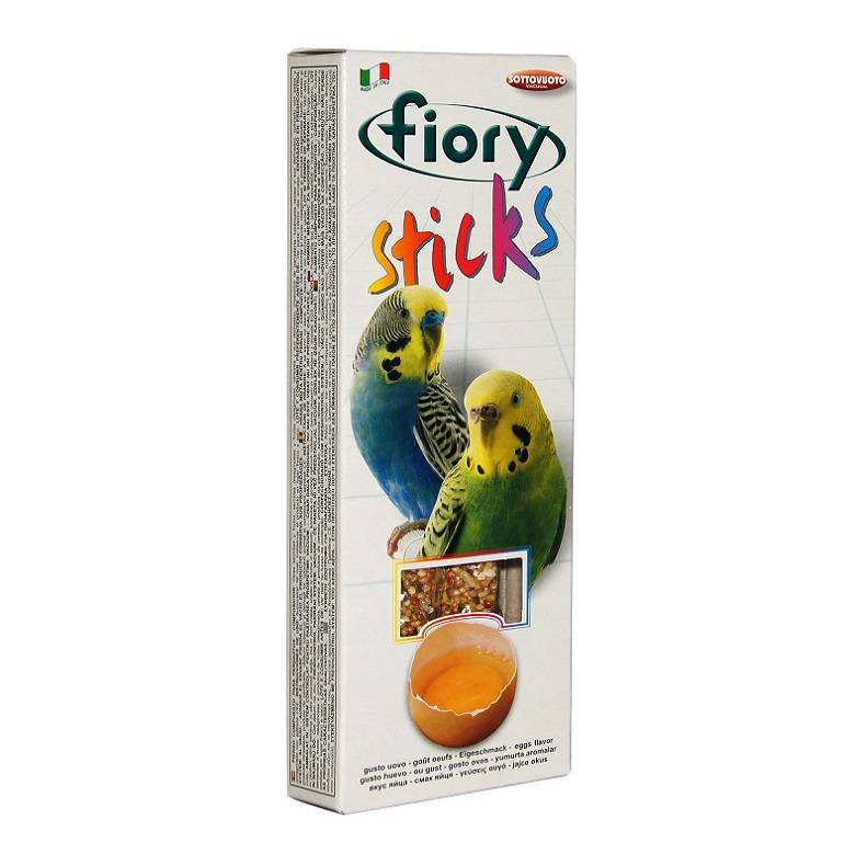 FIORY палочки для попугаев с яйцом. Яичные палочки помогут вашей птичке не просто получить удовольствие от восхитительного лакомства, но и укрепить здоровье. Палочки с девятью различными элементами, среди которых есть семена сафлора, слегка маслянистого по составу (полезен при запорах, а также используется для улучшения пигментации оперения птиц). Клейкий элемент особенно вкусен, позволяет птицам легко его клевать, не раскалывая их на части и не разбрасывая крошки по дну клетки. Поскольку продукт отличается высоким содержанием белка, им не следует злоупотреблять. Как и все подобного рода дополнительное питание, палочки считаются лакомством и являются добавкой к обычному рациону. Палочки удобны для закрепления в клетке, а попугаю удобно склевывать отдельные семечки, не ломая при этом всю палочку.