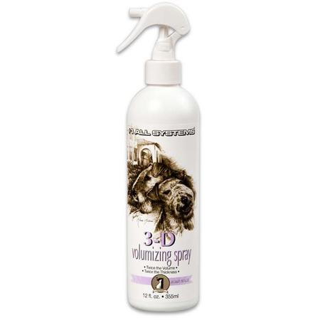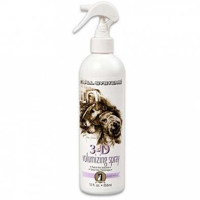 1 All Systems (Ол Системс) спрей "3Д Волюмайзинг" для кошек и собак. Спрей прекрасно увеличивает объем и густоту шерсти в 2 раза. Консистенция спрея не липкая и не жирная, а при распылении воды на шерсть позволяет менять стиль укладки. Способ применения: Нанесите необходимое количество на чистую, свежевымытую шерсть и моделируйте прическу как обычно. Чем больше спрея использовано, тем больше густота и объем шерсти. Может быть использован по всей поверхности тела, по всему объему шерсти или только на корнях волос, что бы приподнять их. Объем 355 мл