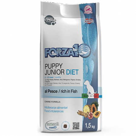 FORZA10 Puppy Junior Diet из рыбы – это легкоусваиваемый, корм с высокой биологической ценностью, богатый ненасыщенными жирными кислотами Омега3, которые присутствуют в рыбьем жире. FORZA10 Puppy Junior Diet из рыбы представляет идеальное питание для всех щенков. Рекомендуется для профилактики и лечения пищевой аллергии и непереносимости на ингредиенты корма и питательные вещества, предупреждая болезни, вызванные гиперчувствительностью к мясу животных интенсивного животноводства. Показания: Для щенков от 2 до 12 месяцев. Для беременных и лактирующих сук. Для сокращения пищевой непереносимости и аллергии. Для гармоничного и сбалансированного роста опорно-двигательного аппарата.