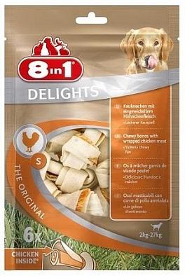 8in1 DELIGHTS S косточки 6х11 см для мелких и средних собак. Аппетитное куриное мясо, завернутое в жесткую говяжью кожу высшего качества – уникальное сочетание жевательной косточки и средства поощрения. • 9 из 10 собак предпочитают лакомство Делайтс* • Уникальный и запатентованный продукт • Заботится о зубах • Уменьшает зубной налет и тем самым предотвращает образование зубного камня • Удовлетворяет природный жевательный инстинкт собаки • Долго жуется, съедается без остатка • Содержит всего 2 % жира • Не содержит искусственных красителей и усилителей вкуса * Исследование предпочтений 2010г. В блистере 6 косточек размером11 см.