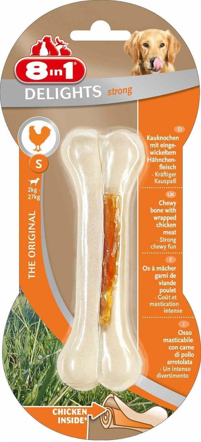 8in1 DELIGHTS Strong S Прессованные жевательные косточки с куриным мясом обеспечивают особенно длительное удовольствие от жевания. Аппетитное куриное мясо в оболочке из плотной прессованной говяжьей кожи высшего качества – уникальное сочетание жевательных косточек и средства поощрения. • Вариант для особенно долгого удовольствия от жевания • Уникальный и запатентованный продукт • Заботится о зубах • Уменьшает зубной налет и тем самым предотвращает образование зубного камня • Удовлетворяет природный жевательный инстинкт собаки • Долго жуется, съедается без остатка • Содержит всего 2 % жира • Не содержит искусственных красителей и усилителей вкуса