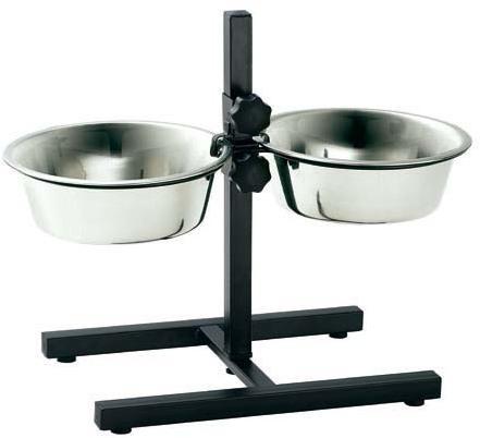 Высота миски 8 см, диаметр - 24,5 см. Миски для собак на штативе – нужная вещь в доме едва ли не каждого владельца собаки крупной породы! Большинство ветеринаров рекомендуют использовать поднятые над полом кормушки. Почему? - Подставки для еды, поднятые над полом, помогают содержать в чистоте место для кормления. - Сухой и влажный корм для собак и кошек не разбрасывается по полу. - Высокая подставка не дает слишком резвым щенкам играть с миской, наполненной водой. - Для того, чтобы проглотить воду, собаке необходимо поднять голову. При этом вода, не попавшая внутрь, выливается из пасти. От этого пол в области кормления постоянно сырой, что приводит к порче покрытия. Если миска поднята, собакам уже нет необходимости так высоко поднимать голову, и то небольшое количество воды, выливающейся из пасти, попадает уже не на пол, а в миску. - Остатки пищи и влага, которые собираются под миской, стоящей на полу, - прекрасная питательная среда для грибков и бактерий. - Кормушки, поднятые над полом, способствуют уменьшению газообразования у собак. Так уж устроен пищеварительный тракт собаки, что вместе с пищей, которую собака ест с миски, расположенной на полу, внутрь попадает много воздуха. Что может привести к повышенному газообразованию, а в некоторых случаях и к острому расширению желудка, что может привести к гибели питомца в течении нескольких часов. Чем выше подставка (конечно, в разумных пределах) , тем меньше воздуха заглатывает собака. - Некоторые животные после приема пищи срыгивают или у них бывает рвота. Причина - «ленивый» пищевод, который не в состоянии протолкнуть пищу в желудок. В результате, часть еды задерживается в пищеводе, что и приводит к неприятным последствиям. Поднятая над полом кормушка устраняет эту проблему. - Подставки для еды сильно облегчают жизнь пожилым и больным животным с проблемами суставов и позвоночника.