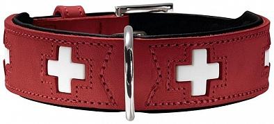 Ошейник для собак средних пород. Два слоя кожи - нижний с подвернутыми краями. Прессованная кожа/телячья кожа, хромированная фурнитура. Обхват шеи 24-28 см. Ширина 2,6 см. Цвет: красный/черный, модный дизайн "швейцарский флаг".